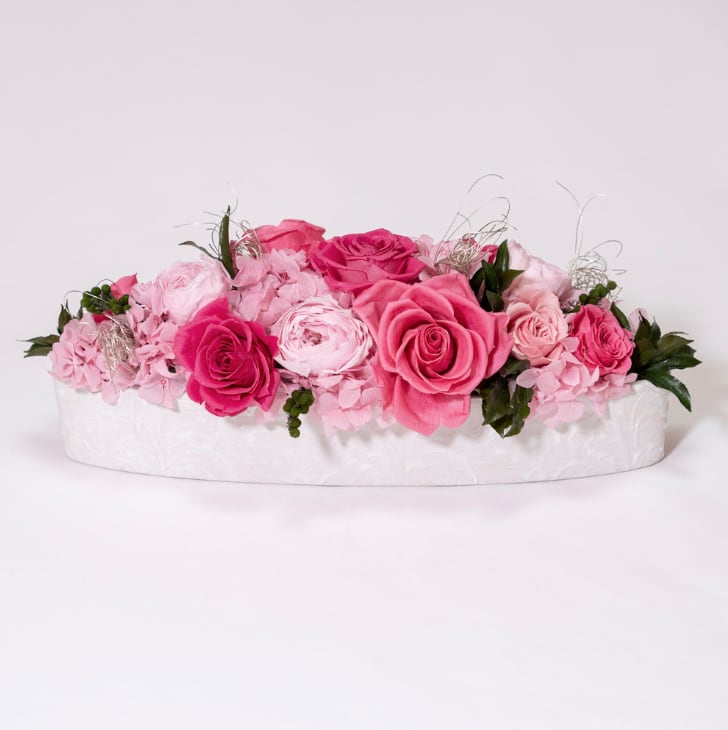 上品な陶器ベースに、色鮮やかなプリザーブドフラワーを贅沢にアレンジしました。