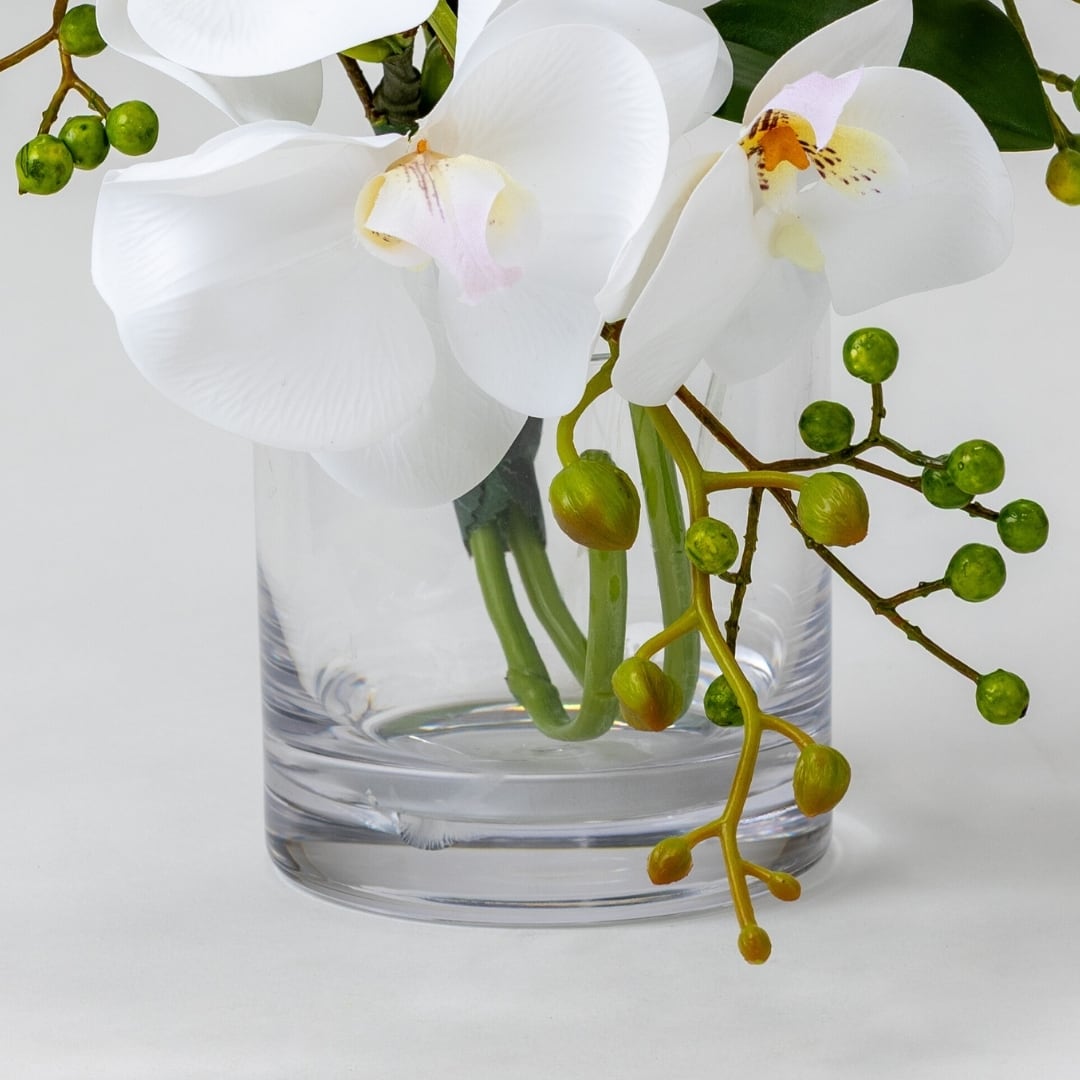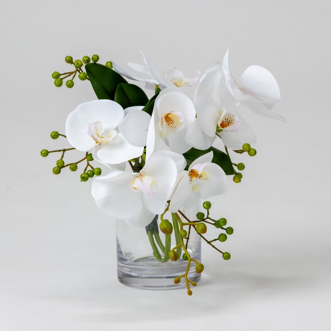 透明感あふれるクリアガラスの器に、純白の胡蝶蘭を上品にアレンジしました。高さ28cmのコンパクトなサイズながら、生花と見間違えるほどのリアルな質感が魅力です。水やり不要で美しさを長く保てるため、日常の空間にも気軽に取り入れられる高級感あるインテリアフラワーです。シンプルながらも洗練された佇まいは、どんなシーンにも調和します。