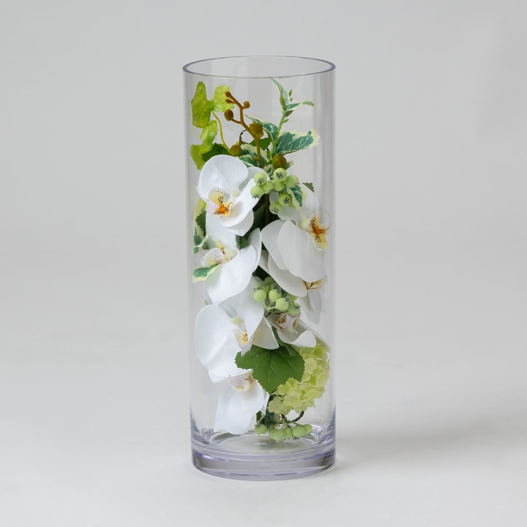 透明感あふれるシリンダー型のガラスベースに、純白の胡蝶蘭を縦に重ねるように配置しました。スリムなフォルムが凛とした印象を与え、空間に洗練されたアクセントを添えます。アーティフィシャルフラワーならではのリアルな質感は、生花と見間違うほどの美しさ。水やり不要で美しさを長く保ち、省スペースでも存在感を放つ高級感あふれるインテリアフラワーです。