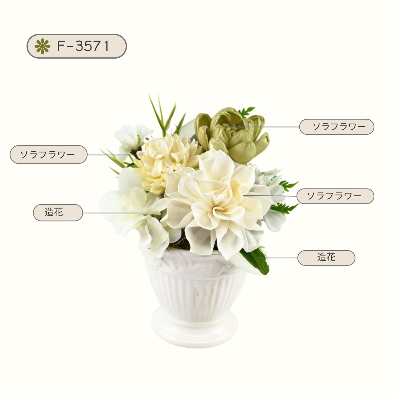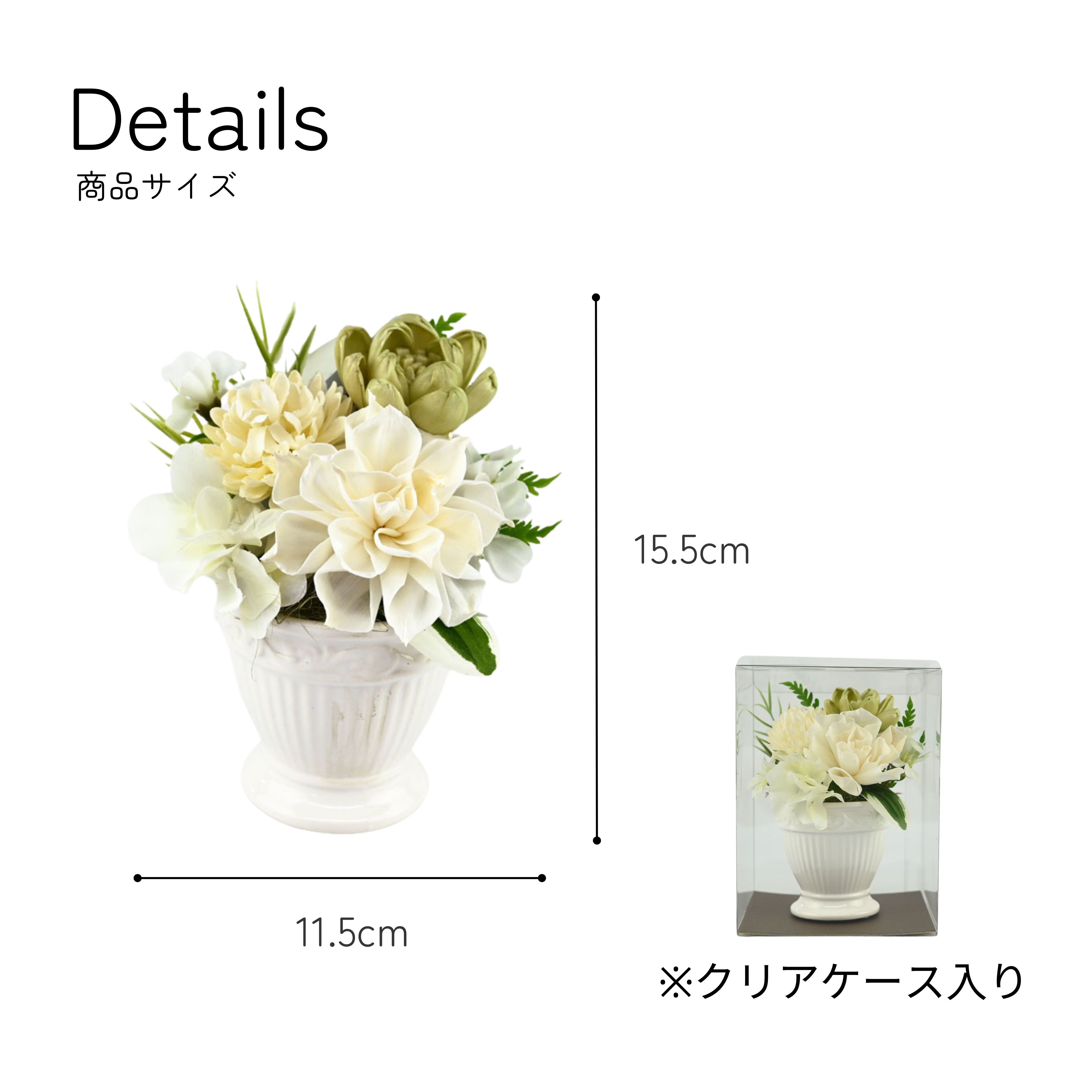 玄関やデスクに飾る華やかなアレンジとしてだけでなく、水やりが不要で衛生的なため、仏花(お供え花)としても適しています。コンパクトなサイズ(幅 11.5cm × 高さ 15.5cm)で、小さな仏壇や供養スペースにもきれいに馴染みます。