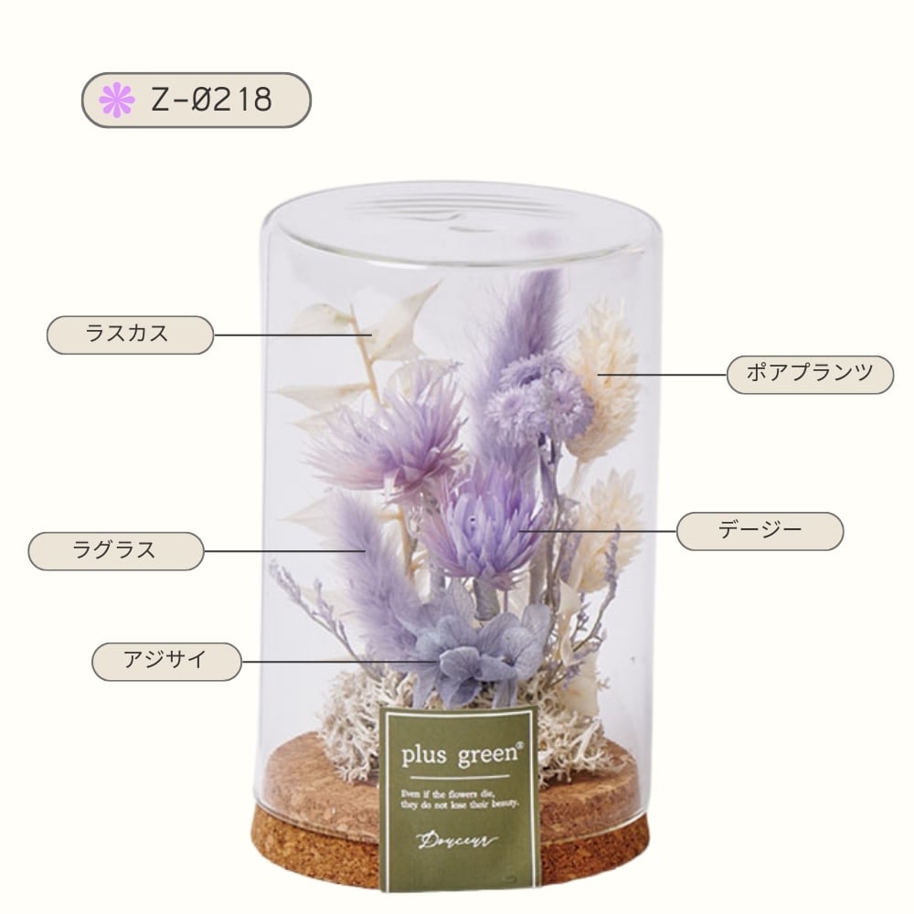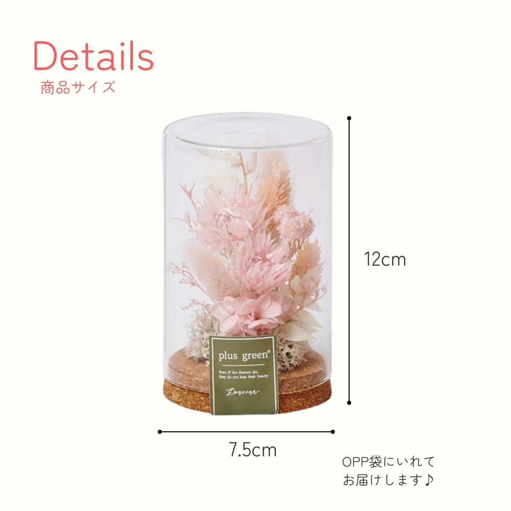 * 仕様:ドライ・プリザーブドフラワー、コルク蓋付ガラスボトル、OPP袋ラッピング付